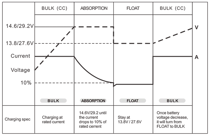 Akumuliatoriaus valdymas (3 pakopų akumuliatoriaus įkrovikliai) Tūrinis / Absorbcija / Plūduriavimas